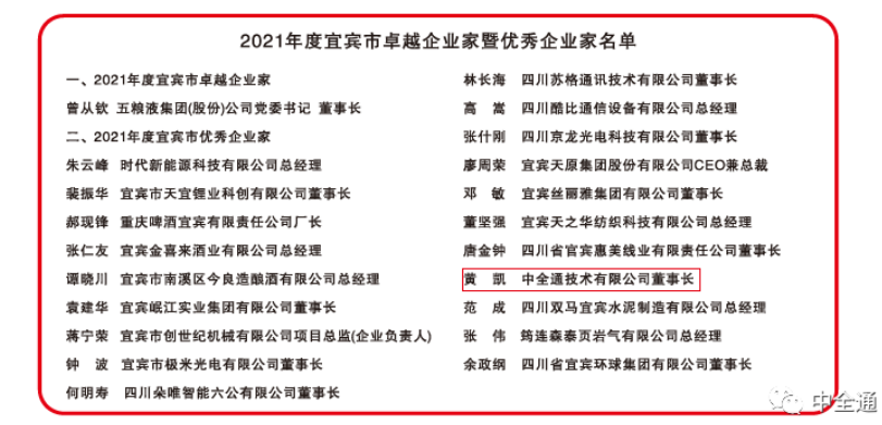 近日,宜宾市人民政府发布了《关于2021年度宜宾市卓越企业家暨优秀企业家评选结果的通报》,表彰一批在2021年间对全市经济作出突出贡献,勇立时代潮头、走在时代前列的卓越企业家暨优秀企业家。中全通技术有限公司董事长黄凯名列其中,荣获“2021年度宜宾市优秀企业家”称号。