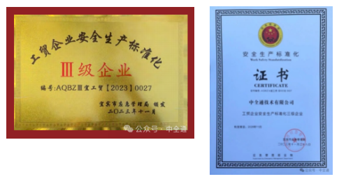 近日,中全通技术有限公司顺利通过宜宾市应急管理局“2023年第四批安全生产标准化三级达标企业(工贸)”认证,并颁发了证书和牌匾,标志着我安全生产工作迈入新的台阶。
