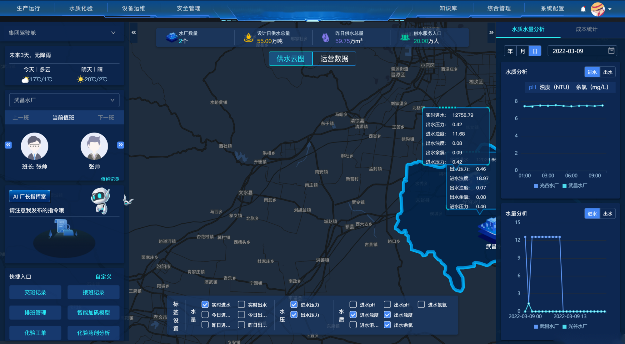 智慧水务一体化平台包含:大数据中心、数字孪生、智慧管网管理平台、智慧营销服务平台、智慧生产管理平台、智慧水务系统支撑平台、SCADA生产调度系统、DMA分区系统、设备管理系统、水质监测管理系统、二次供水管理系统、乡镇供水站管理系统、应急指挥管理系统、远传水表集抄系统、业扩报装管理系统、客服工单系统、供水管网GIS系统等功能模块。