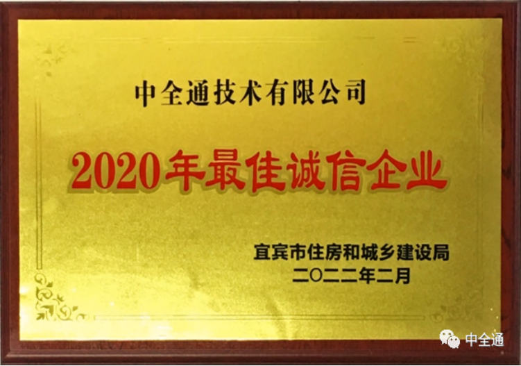 中全通技术有限公司自成立以来,始终坚持“以质量求生存,以信誉求发展”的经营理念,高度重视企业诚信体系建设,自2016年以来连续四年荣获宜宾市建筑业诚信企业称号,2020年荣获宜宾市建筑业“2020年最佳诚信企业”称号。